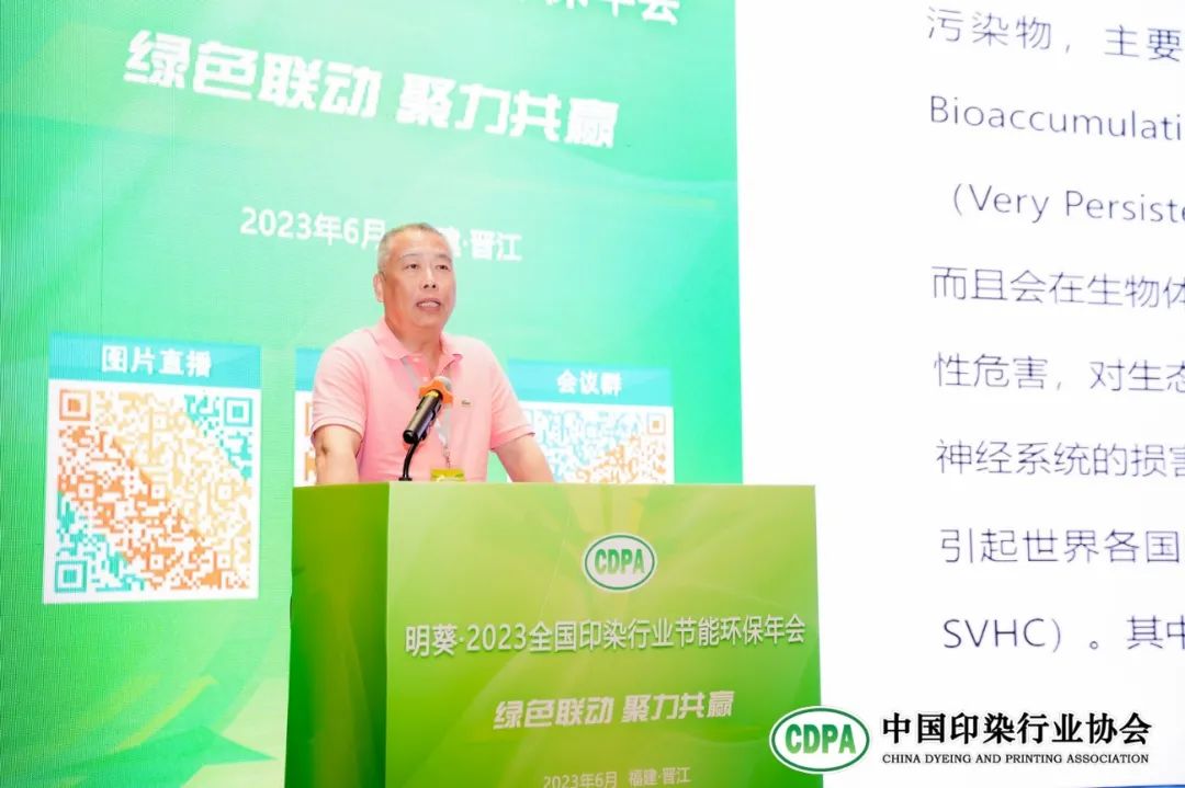 上海天祥質(zhì)量技術(shù)服務(wù)有限公司顧問王建平作“《重點(diǎn)管控新污染物清單(2023年版)》對印染行業(yè)的影響及其應(yīng)對”專題報告。王建平介紹了重點(diǎn)管控新污染物的定義、《重點(diǎn)管控新污染物清單(2023年版)》發(fā)布的目的和意義,重點(diǎn)講解了《清單》涉及的14類物質(zhì)及管控方式,同時詳細(xì)分析了PFOS類/PFOA類、PFHxS類、十溴二苯醚、短鏈氯化石蠟、壬基酚等物質(zhì)對印染行業(yè)的影響及其應(yīng)對方法。
