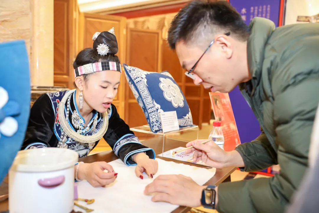 貴州省黔東南苗族侗族自治州丹寨縣的苗族蠟染技藝非遺傳承人、天才媽媽蠟染夢想工坊骨干張曉丹現(xiàn)場展示苗族蠟染技藝