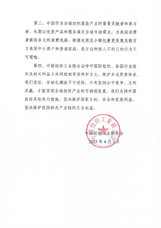 第四,中國紡織工業聯合會呼吁國際組織、各國行業組織及相關利益方共同抵制貿易保護主義,維護多邊貿易體系。我們堅信,全球化潮流不可逆轉,只有堅持公平競爭、互利共贏,才能實現全球紡織產業的可持續發展。我們支持中國政府采取有力措施,堅決維護國家主權、安全和發展利益,堅決維護我國相關產業鏈的正當權益。