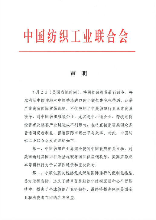 4月2日(美國當地時間),特朗普政府簽署行政令,將取消從中國內地和中國香港進口的小額包裹免稅待遇。此舉嚴重違背國際貿易規則,不僅破壞了中美紡織行業正常貿易秩序,對中國紡織服裝企業,尤其是中小微企業、跨境電商經營者及配套產業鏈造成不利影響,也將直接損害美國眾多普通消費者利益,損害國際市場公平與效率。對此,中國紡織工業聯合會發表聲明如下: