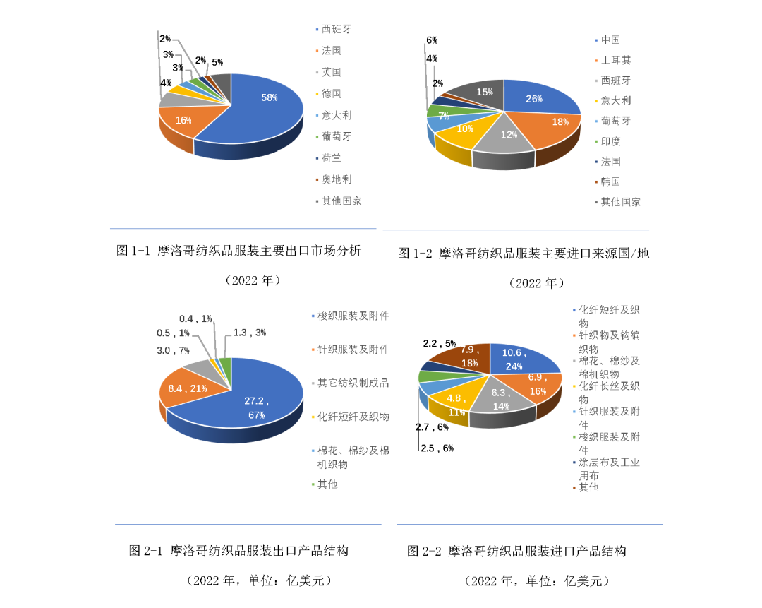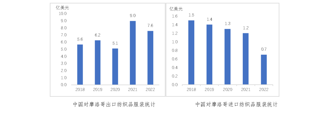 摩洛哥是首個加入“一帶一路”的馬格里布聯盟國家,在“一帶一路”倡議引領下,中摩兩國經貿合作不斷發展。當前,摩洛哥是中國在非洲的第十大貿易伙伴,中國是摩洛哥第三大貿易伙伴、第二大進口來源國。根據中國海關統計,2022年中摩雙邊出口及進口貨物貿易額分別為57.4億美元和9.1億美元,其中紡織品服裝出口額及進口額分別占中國對摩出口及自摩進口貿易額比重的13.2%和7.8%。
