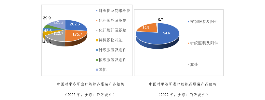 2022年中國對摩洛哥出口紡織品服裝7.6億美元,主要出口產品包括針織面料(占比26.8%)、化學纖維紗線及面料(化纖短纖及長絲紗線、織物合計占比39.5%)等;同期,中國從摩洛哥進口紡織品服裝0.7億美元,主要進口產品為針、梭織服裝及衣著附件,合計占比達99%。