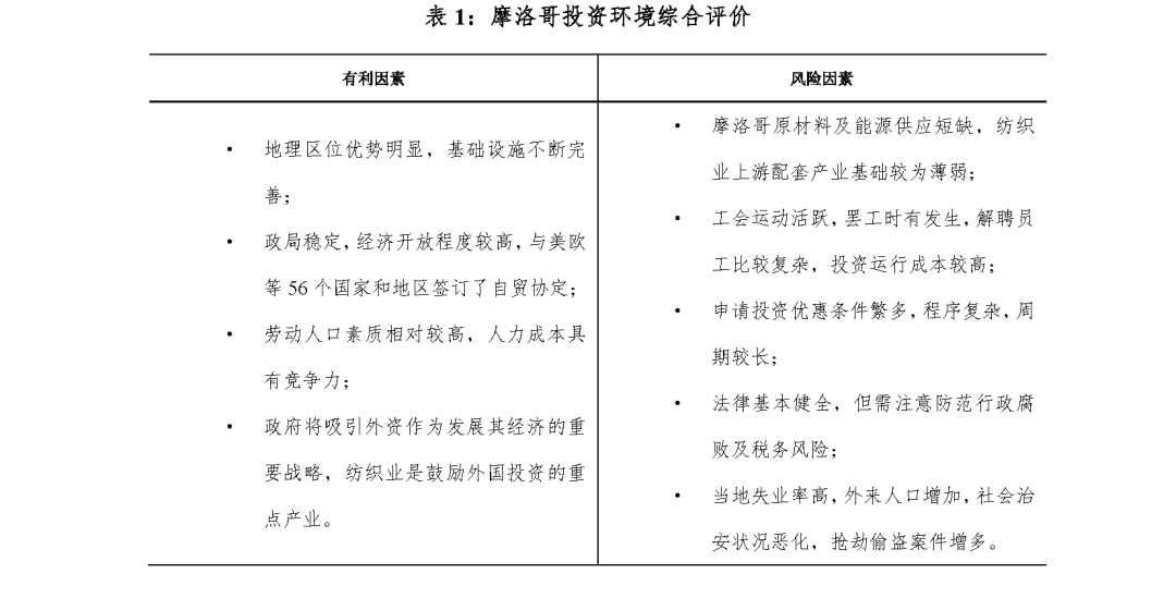 (2)紡織服裝業是摩洛哥重要的傳統支柱產業,主要面向歐洲市場,與一些國際品牌具有良好采購合作關系。與歐盟和美國均簽有自貿協定,紡織服裝產品享受零關稅進入歐美市場優惠,有條件成為中國紡織服裝企業通過海外布局進入歐美市場的平臺。