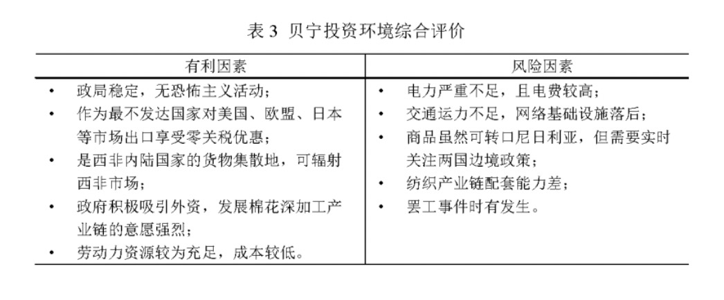 (1)貝寧政局穩定,棉花資源較為豐富,政府提高棉花本地加工率、發展棉紡織深加工業意愿強烈,在美國、歐盟、日本等絕大多數市場均享受零關稅優惠政策,可輻射西非市場,均是中國紡織企業赴貝寧投資的有利因素。