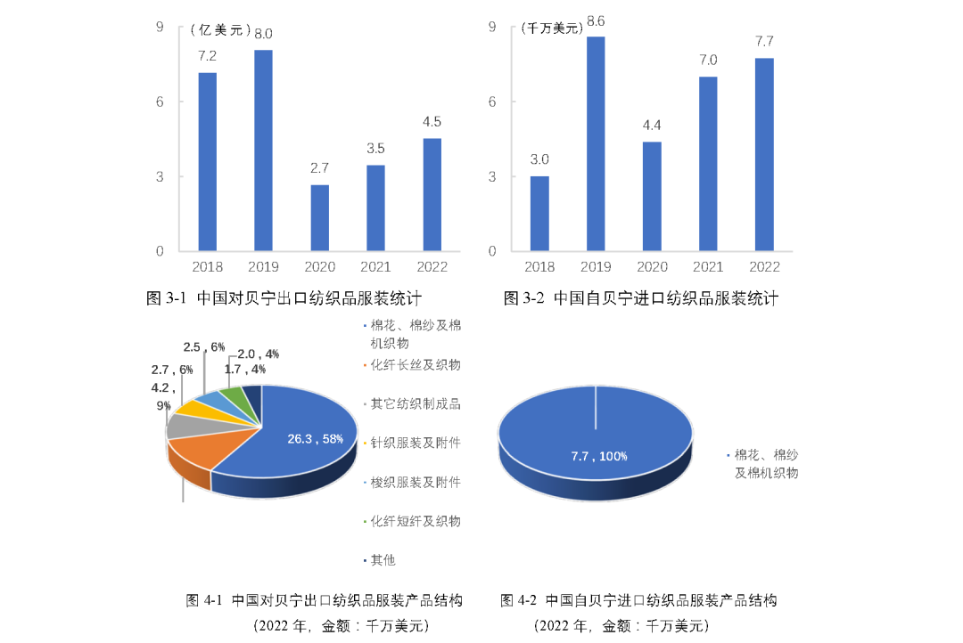 紡織行業在中貝雙邊貿易中扮演重要角色,根據中國海關統計,2022年,中國與貝寧紡織品服裝進出口總額為5.3億美元,占中貝雙邊貿易總額的比重超過1/4。其中,中國對貝寧紡織品服裝出口額為4.5億美元,主要出口產品為棉紗及棉機織物(占比58%)、化纖長絲及織物(占比13%)等;自貝寧進口額為7720萬美元,進口產品只有棉花。