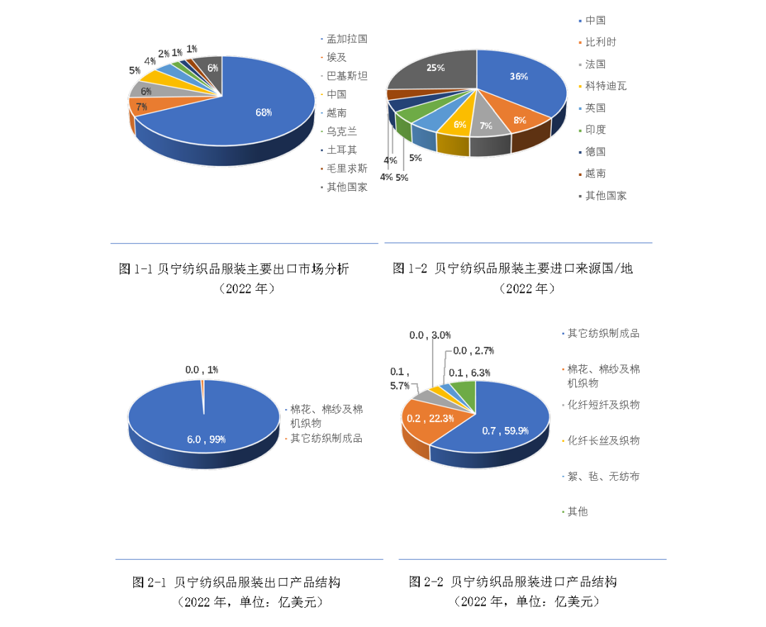 貝寧紡織品服裝貿易規模較小,幾乎僅出口棉花,進口品類相對分散。根據貝寧國家經濟分析與統計局數據,2022年,貝寧紡織品服裝(海關HS編碼50~63章紡織原料、紡織品及服裝)出口額為6.1億美元,主要出口市場是孟加拉國、埃及、巴基斯坦、中國,其中孟加拉國占出口總額的68%。從出口品類看,棉花出口額占紡織品服裝出口總額的99%。同期,紡織品服裝進口額為1.1億美元,中國是第一大進口來源地,約占進口總額的36%,其次是比利時、法國、科特迪瓦等。主要進口產品是終端紡織制成品(占比59.9%),棉花、棉紗及棉機織物(占比22.3%)。