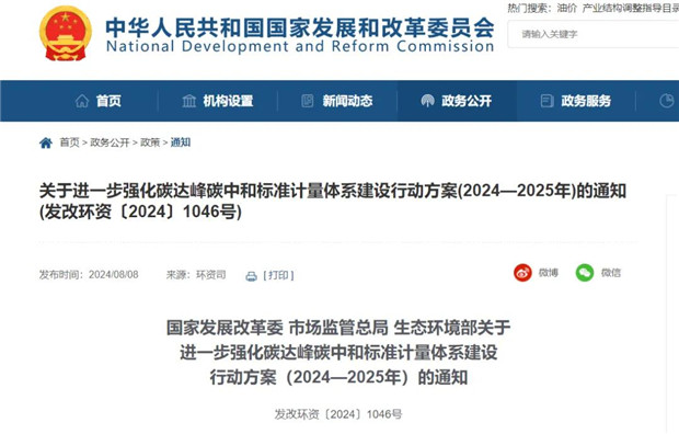 國家發展改革委、市場監管總局、生態環境部聯合發布《關于進一步強化碳達峰碳中和標準計量體系建設行動方案(2024—2025年)》的通知。