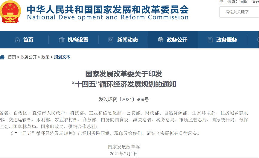 日前,國家發展改革委印發《“十四五”循環經濟發展規劃》
