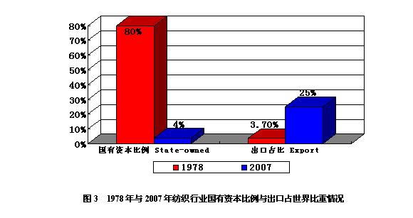 在產(chǎn)業(yè)資本結(jié)構(gòu)方面,中國紡織服裝業(yè)正向多元化方向發(fā)展。1980年紡織服裝業(yè)中,國有資本占80%以上(圖3),而現(xiàn)在海外資本、外資企業(yè)占中國紡織服裝業(yè)近1/4,出口占40%以上,民營資本占據(jù)主導地位。據(jù)海關統(tǒng)計,2008年一季度,紡織三資企業(yè)出口129億美元,占全國紡織出口的34.4%。