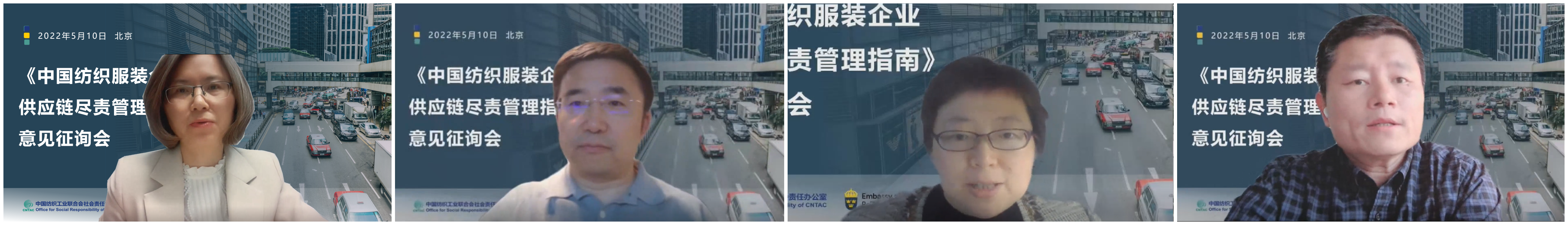 2022年5月10日下午,由中國紡織工業聯合會社會責任辦公室主辦的《中國紡織服裝企業社會與環境盡責管理指南(征求意見稿)》(暫定名,下稱“《盡責管理指南》”或“指南”)意見征詢會在線上成功舉辦。來自南開大學、北京工商大學、聯合國開發計劃署(UNDP)、聯合國兒童基金會(UNICEF)、經濟合作與發展組織(OECD)、德國國際合作機構(GIZ)等十五家機構的二十余位專家參加了本次會議,就盡責管理指南的改進與實施進行了全面、深入的討論。