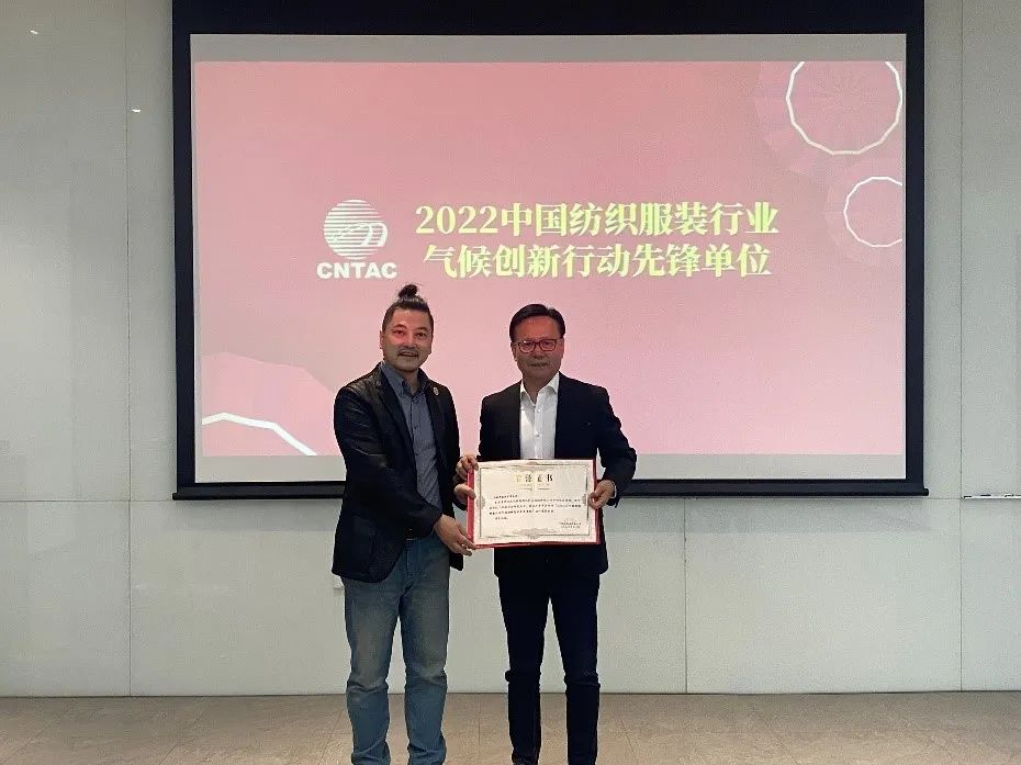 九牧王是全球銷量領先的男褲專家,專注男褲領域33年,在泉州市經濟技術開發區清濛園區與晉江兩地均設有生產基地,其采用業務縱向一體化的模式,是集研發設計、生產、銷售為一體的時尚產業公司。作為國內男褲行業龍頭,九牧王一直是中國紡織工業聯合會社會責任辦公室推動行業可持續工作的重點合作伙伴。中紡聯社責辦于2021年6月1日正式啟動了“中國時尚品牌氣候創新碳中和加速計劃”(簡稱“30·60碳中和加速計劃”),優先支持30家重點品牌企業和60家重點制造企業開展氣候創新行動。對此,九牧王于2022年3月加入“30·60碳中和加速計劃”,全面梳理企業碳排放基線情況,制定九牧王雙碳戰略規劃。在本次氣候訓練營中,中紡聯社責辦副主任兼可持續發展合作部主任胡柯華九牧王董事長林聰穎先生頒發“2022中國紡織服裝行業氣候創新行動先鋒單位”證書。