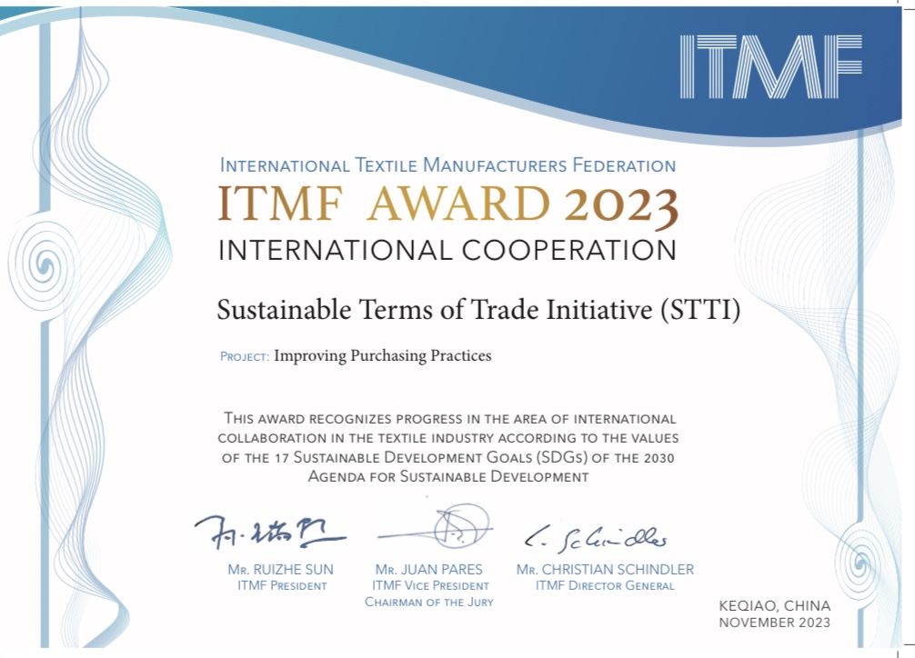 | 可持續(xù)貿(mào)易條款倡議項目“可持續(xù)貿(mào)易條款倡議”榮獲國際紡聯(lián)2023年度國際合作獎 |