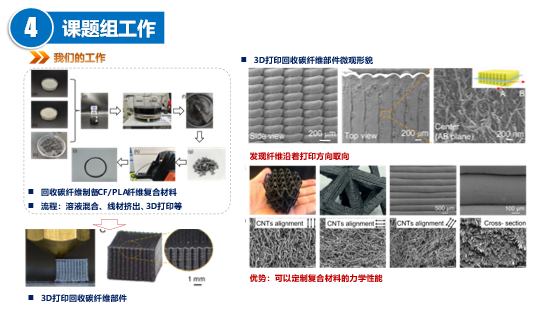 史寶會老師介紹了纖維復合材料的回收意義、回收方法、以及回收再利用技術。史寶會老師指出,機械回收法是纖維復合材料回收的最主要方法。目前,纖維復合材料回收再利用技術主要分為四種:直接成型、非織造布直接成型、纖維整理后成型技術、以及碳纖維織造浸膠。另外,史寶會老師團隊研究發(fā)現(xiàn),3D打印回收碳纖維是隨著打印部件的方向而取向的,同時發(fā)現(xiàn)打印的短碳纖維熱塑復合材料部件具有優(yōu)異的熱穩(wěn)定性,且可用于多種場景,包括服裝的制作,紗線的制作、電池的制作等。