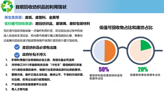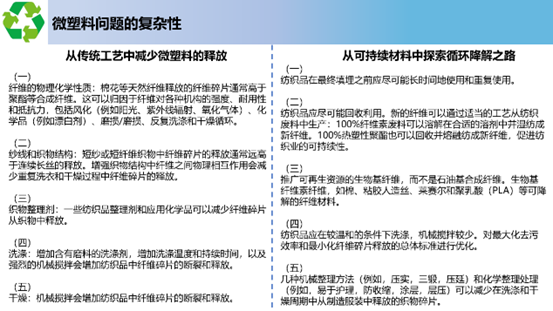關曉宇博士首先介紹了“循環(huán)經濟”的概念,回收紡織品的利用現(xiàn)狀,以及當前面臨的微塑料問題的復雜性。關博士指出,如果可以將當前的“線性經濟”轉變成“循環(huán)經濟”,將目前數量龐大的廢舊紡織服裝利用起來,將是對于“循環(huán)經濟”而言,非常大的貢獻。同時,通過不同的形式,比如建立階梯化的利用,對廢舊紡織品高值化的開發(fā)和應用,以及呼吁政府進行一定的增值稅減免以鼓勵企業(yè)進行廢舊紡織品回收和開發(fā),將是紡織材料行業(yè)未來的出路。在應對微塑料問題方面,關博士提出,新材料的誕生,并不能完全解決已出現(xiàn)的微塑料問題,比如生物基塑料在分解時,會減少土壤中的營養(yǎng)成分。