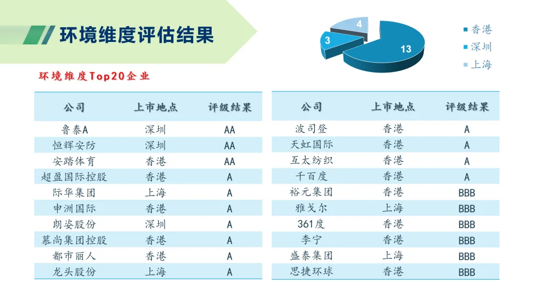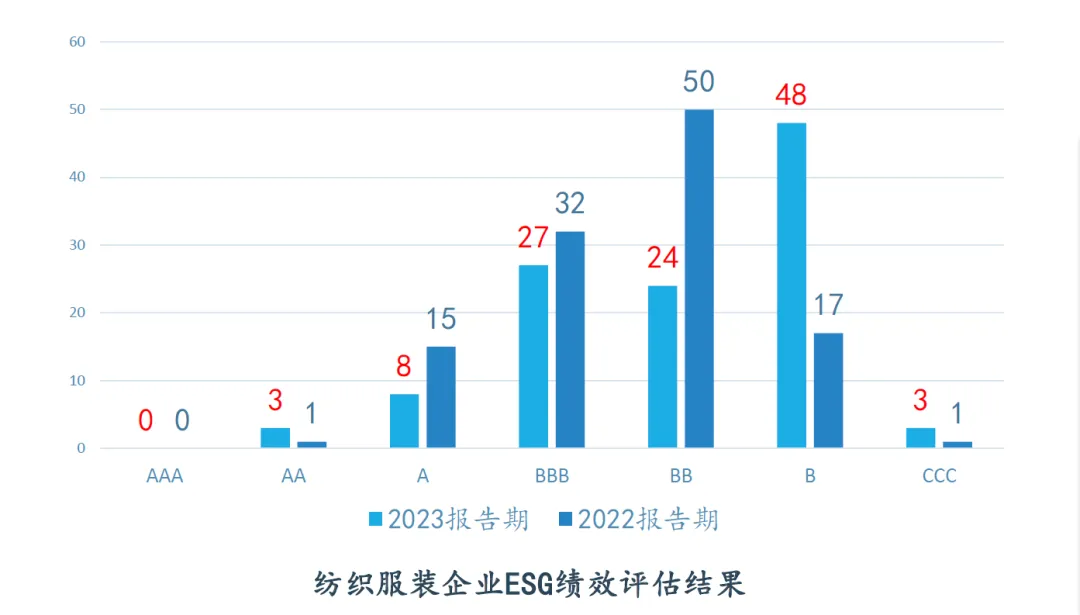 相較2022報(bào)告期紡織服裝上市企業(yè)總體ESG評(píng)級(jí)處在高分區(qū)間的數(shù)量有所下降,未有企業(yè)達(dá)到AAA級(jí),雖然達(dá)到AA級(jí)的企業(yè)數(shù)量有所增加,但達(dá)到A級(jí)的企業(yè)數(shù)量減少較多。處在低分區(qū)間的企業(yè)數(shù)量也有所提升,B級(jí)企業(yè)增加182%,提示企業(yè)對(duì)于更新及更細(xì)致的ESG信息披露要求的回應(yīng)較為不及時(shí),仍有較大的進(jìn)步空間。
