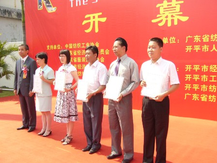 2008年10月17日,第五屆中國(開平)牛仔服裝節(jié)開幕式上,陳樹津副會長代表中國紡織工業(yè)協(xié)會為開平春暉股份有限公司、開平奔達(dá)紡織有限公司、開平富琳紡織制衣有限公司、開平平豐紡織有限公司和開平市英協(xié)制衣廠有限