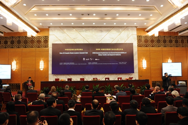 --中歐供應(yīng)鏈社會責(zé)任峰會暨紡織服裝行業(yè)社會責(zé)任年會隆重召開 2008年11月18日,中國紡織工業(yè)協(xié)會與歐洲外貿(mào)協(xié)會在北京人民大會堂召開“中歐供應(yīng)鏈社會責(zé)任峰會&rdquo