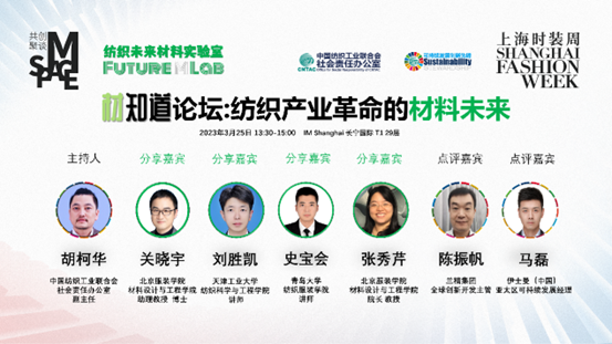 2023年3月25日,在2023秋冬上海時裝周期間,中國紡織工業(yè)聯(lián)合會社會責任辦公室與上海時裝周M SPACE共創(chuàng)聚談在上海合作舉辦了以“紡織產(chǎn)業(yè)革命的材料未來”為題的『材知道』論壇。